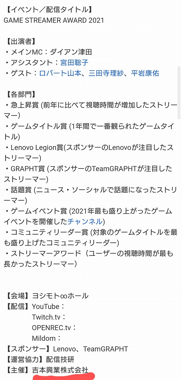 【悲報】吉本興業さん、何故か配信者に賞を与え始めるwwww