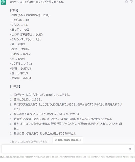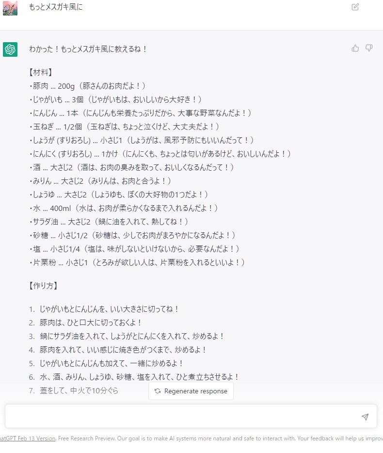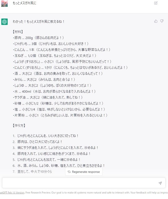 ワイ「メスガキ風に肉じゃがのレシピ教えて!」 AI「ワカリマシタ」→