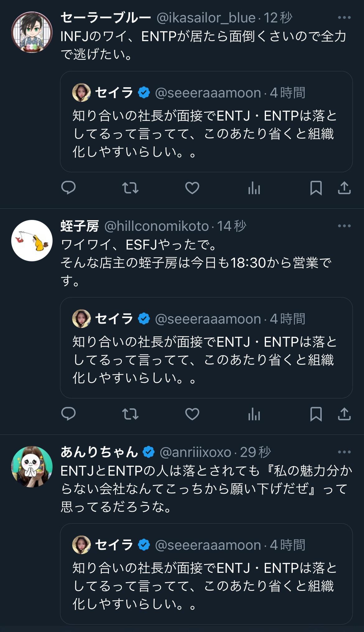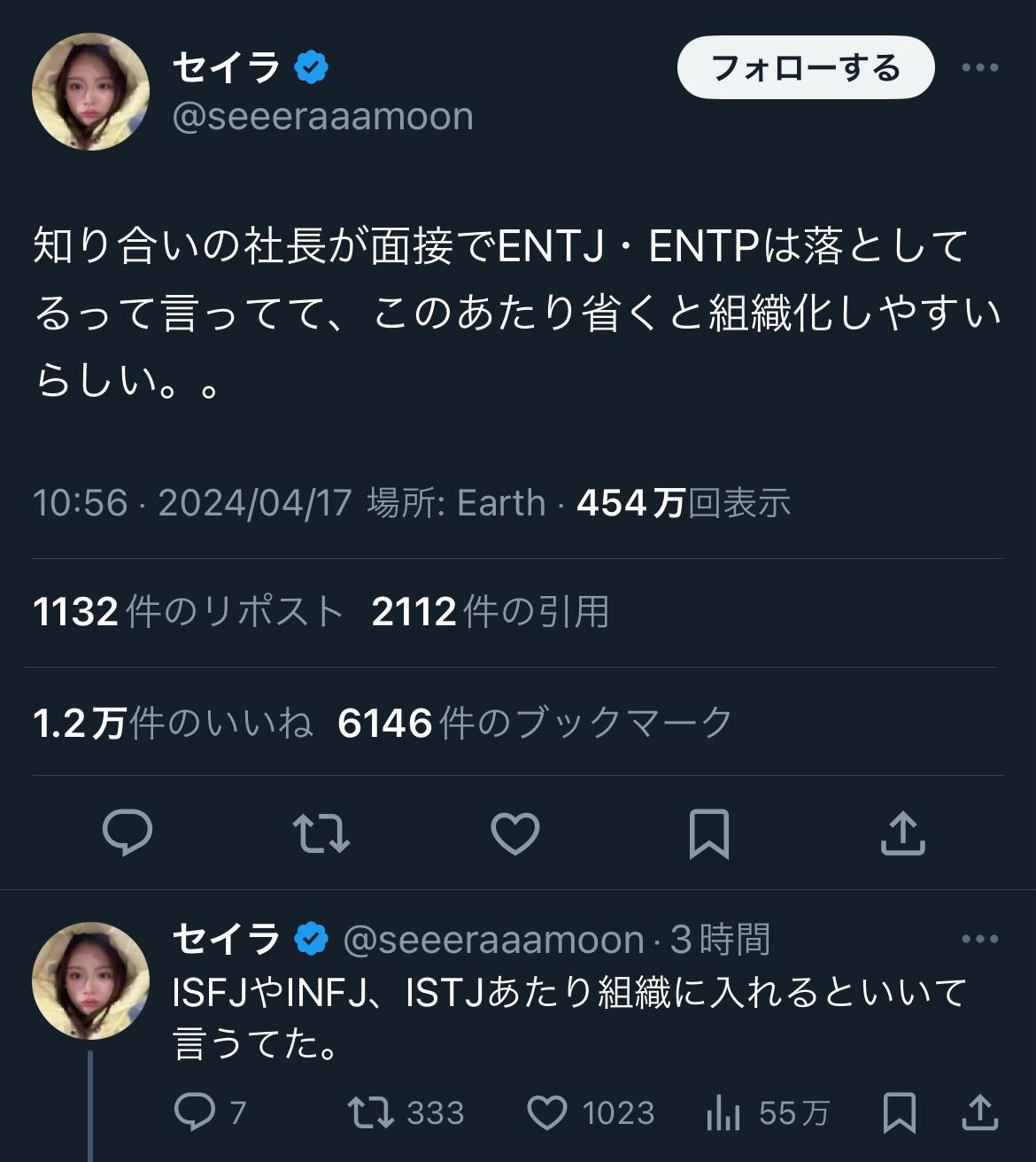 知り合いの社長が面接でENTJ・ENTPは落としてるって言ってて、このあたり省くと組織化しやすいらしい。。