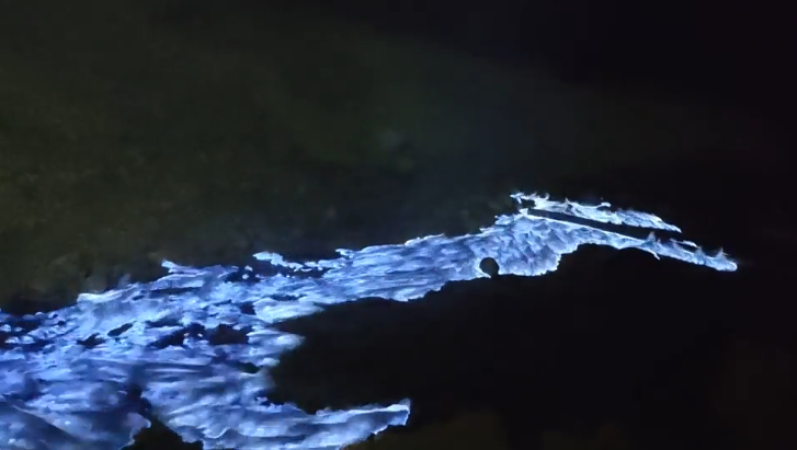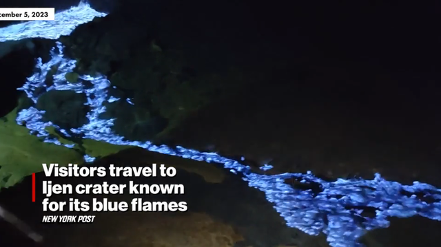 夫婦はイジェン山で有名な“青い炎”を見るため、ツアーに参加したという。火山の亀裂から高圧で噴出している硫黄ガスが燃焼する際に青い光を発することから、青い炎と呼ばれている。一部の硫黄ガスは液状に凝縮し、燃えながら山肌を流れていく。